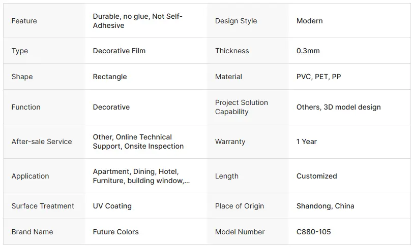 Fîlimek Blisterê ya Rengîn a Modern materyalek fîlimê ya xemilandî ye ku plastîkek mezin a molekuler wekî materyalê bingehîn bikar tîne. Piştî dermankirin û dermankirina hevrînê, ew bi riya "pêvajoya blister" ve tê bidestxistin (makîneya adsorkirina vacuum). Ew "rengê yekalî, plastîkek yekgirtî, û lêçûnên bihêz, û lêçûnên zêde", û bi berfirehî di zeviyên wekî mobîlya, xemilandin û pakkirinê de tête bikar anîn. Ew yek ji materyalên bi gelemperî di sêwirana şêwaza nûjenîst a nûjen de ye.
